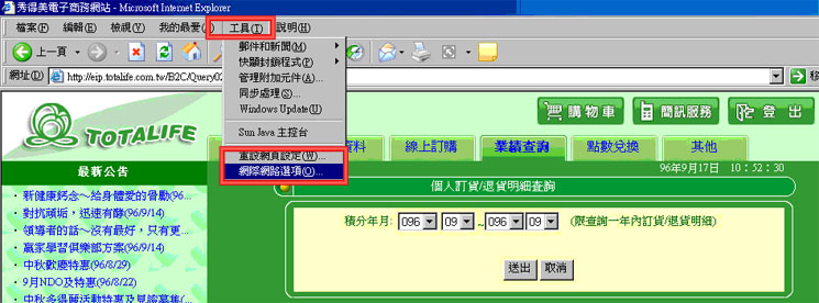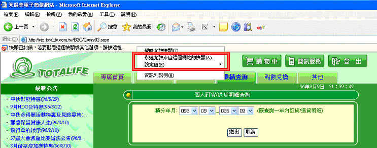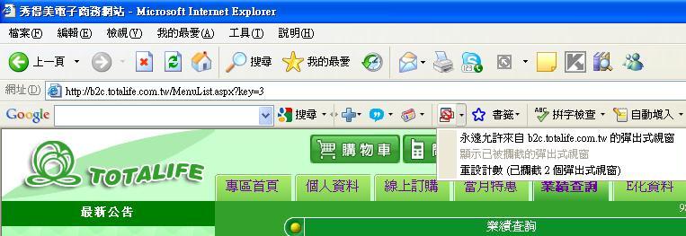 ,若無出現直接進點放入購物車,則資料將不會訂購完成,請查看是否為快顯已封鎖或是被工具列阻擋;若當您點入業績查詢項目並按下送出按鈕,畫面卻沒有任何反應時,請查看是否為快顯已封鎖或是被工具列阻擋。