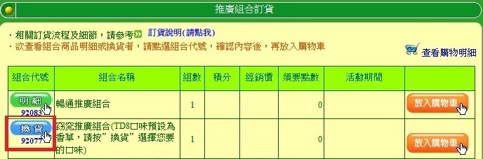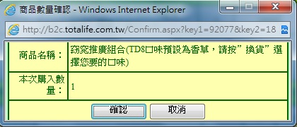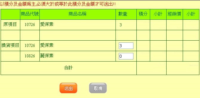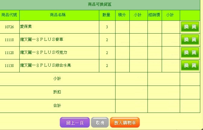 若您點入線上訂購並點下換貨按鈕,可依個人要購買的商品換貨,再換貨完成後並點下放入購物車,會出現商品數量確認及是否繼續購物的視窗會彈跳出來