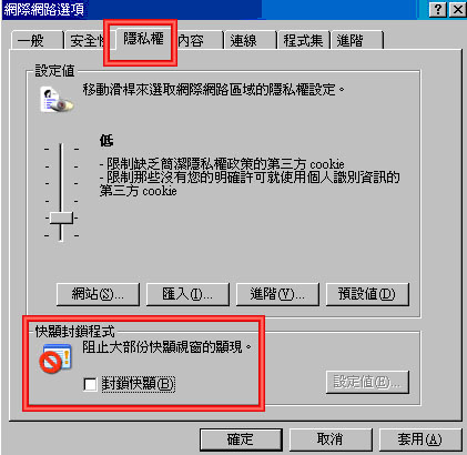 如您使用IE,請選【工具】下的【網際網路選項】打開【隱私】頁籤,按下【預設】值、套用,再點選【進階】內【覆寫自動 cookie 處理】按【確定】即可